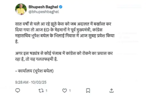 ईडी के कार्रवाई के बाद भूपेश बघेल की तरफ से पहली प्रतिक्रिया आई है। उन्होंने सोशल मीडिया प्लेटफॉर्म एक्स पर एक पोस्ट कर कहा है कि, सात वर्षों से चले आ रहे झूठे केस को जब कोर्ट में बर्खास्त कर दिया गया तो ED के मेहमानों ने पूर्व सीएम के घर पर दबिश दी है। इस षड्यंत्र से कोई पंजाब में कांग्रेस को रोकने का प्रयास कर रहा है, तो यह गलतफहमी है।