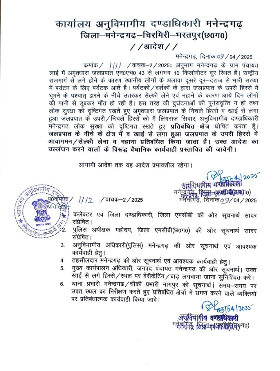जिले की विकासखंड मनेन्द्रगढ़ के प्रसिद्ध पर्यटन स्थल अमृतधारा जलप्रपात में लगातार हो रहे हादसों को ध्यान में रखते हुए प्रशासन ने एक बड़ा और सख्त फैसला लिया है. अनुविभागीय दण्डाधिकारी लिंगराज सिदार ने इसके लिए आदेश जारी किया है. जलप्रपात के निचले हिस्से और खाई से लगे ऊपरी हिस्से को अब प्रतिबंधित क्षेत्र घोषित कर दिया गया है.