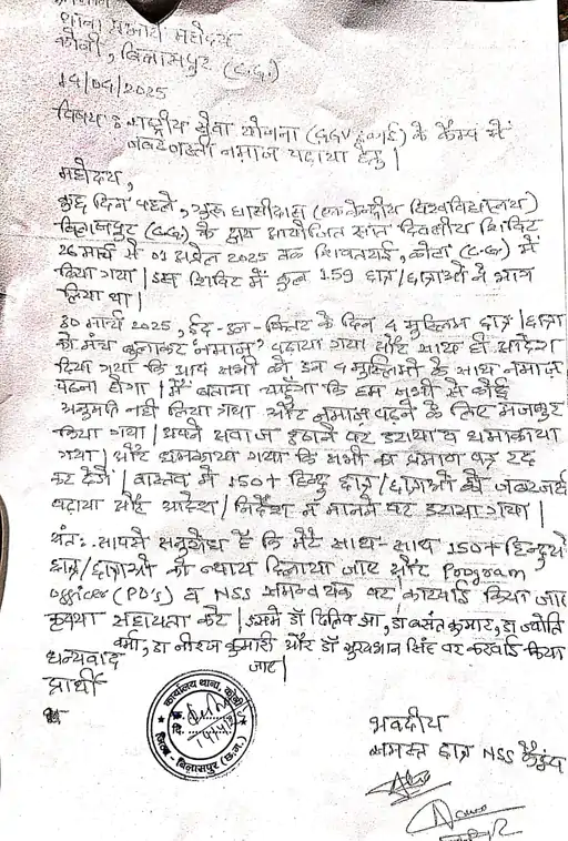 गुरु घासीदास विश्वविद्यालय के एनएसएस कैंप में हिंदू छात्रों को जबरदस्ती नमाज पढ़ाने का मामला सामने आया है.जानकारी के अनुसार 26 अप्रैल से 1 मार्च के बीच NSS कैंप का आयोजन किया गया था.जिनमे कुल 159 छात्र शामिल थे जिनमे से 4 छात्र मुस्लिम थे और बाकी छात्र हिन्दू थे.बीच में ईद पड़ा इस दिन प्रोग्राम ऑफिसर ने सभी छात्रों को बुलाया और और जबरन नमाज़ पढाया.