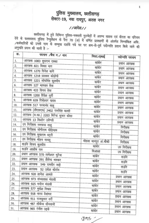 डीजीपी अरुणदेव गौतम ने इसे लेकर आदेश जारी किया है.आदेश में इस बात का भी जिक्र है कि नक्सल ऑपरेशंस में बहादुरी दिखाने वाले जवानों को यह प्रमोशन दिया जा रहा है। इसके तहत हवलदार ASI बना दिए गए हैं, कुछ को सब इंस्पेक्टर और इंस्पेक्टर की पोस्ट भी दी गई है.