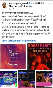 इन आयोजनों को किसका संरक्षण है…? शराब, ड्रग्स परोसने के बाद अब नग्नता परोसने की बारी…21 सितम्बर का यह आयोजन रायपुर में कदापि नहीं होने देंगे। अपने शहर को दागदार नहीं होने देंगे।