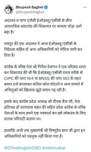 इस मामले में भूपेश बघेल ने सोशल मीडिया पर पोस्ट करते हुए कहा, अदालत व जांच एजेंसी ईओडब्लू/एसीबी के बीच आपराधिक सांठगांठ की शिकायत पर मामला थोड़ा आगे बढ़ा है। रायपुर की एक अदालत ने आज ईओडब्लू/एसीबी के निदेशक सहित दो अन्य अधिकारियों को नोटिस जारी कर दिया है।