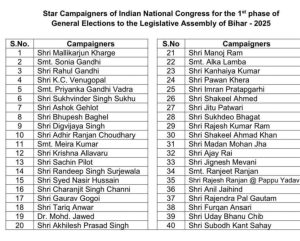 Bihar Assembly Elections 2025: बिहार विधानसभा चुनाव को लेकर कांग्रेस पार्टी ने अपने 40 स्टार प्रचारकों की सूची जारी कर दी है। इस सूची में छत्तीसगढ़ के पूर्व मुख्यमंत्री भूपेश बघेल का नाम भी शामिल किया गया है। कांग्रेस के शीर्ष नेताओं – राष्ट्रीय अध्यक्ष मल्लिकार्जुन खड़गे, सोनिया गांधी, राहुल गांधी और प्रियंका गांधी के साथ राजस्थान के पूर्व सीएम अशोक गहलोत, सचिन पायलट, रणदीप सुरजेवाला, कमलनाथ सहित कई वरिष्ठ नेताओं के नाम भी स्टार प्रचारक सूची में हैं।