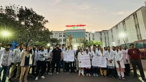 रायपुर। प्रदेश में मेडिकल पीजी (पोस्ट ग्रेजुएट) सीटों की नई वितरण व्यवस्था को लेकर सोमवार को डॉक्टरों और मेडिकल छात्रों ने कड़ा विरोध प्रदर्शन किया। मेडिकल कॉलेज रायपुर सहित प्रदेशभर के स्वास्थ्य केंद्रों में डॉक्टरों ने ब्लैक-रिबन (काला फीता) पहनकर और कैंडल मार्च निकालकर प्रवेश नियमों में हुए संशोधन का विरोध किया।