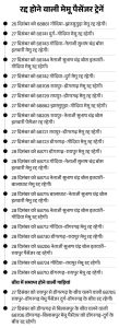 रद्द होने वाली प्रमुख गाड़ियों में रायपुर-डोंगरगढ़, गोंदिया-नेताजी सुभाष चंद्र बोस (इतवारी), बालाघाट-इतवारी और डोंगरगढ़-रायपुर मेमू ट्रेनें शामिल हैं। मेमू पैसेंजर ट्रेनों के रद्द होने से लोकल यात्रियों को मुश्किलों का सामना करना पड़ेगा।