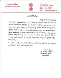जारी आदेश में उल्लेख किया गया है कि छत्तीसगढ़ कुशाभाऊ ठाकरे पत्रकारिता एवं जनसंचार विश्वविद्यालय अधिनियम, 2004 तथा संशोधन अधिनियम 2025 की धारा 11 की उपधारा (1) में प्रदत्त शक्तियों का प्रयोग करते हुए राज्यपाल एवं कुलाधिपति द्वारा यह नियुक्ति की गई है।