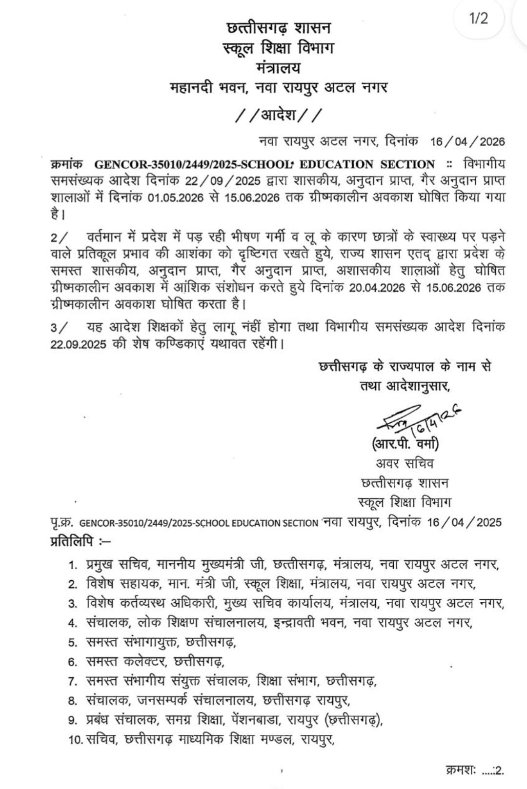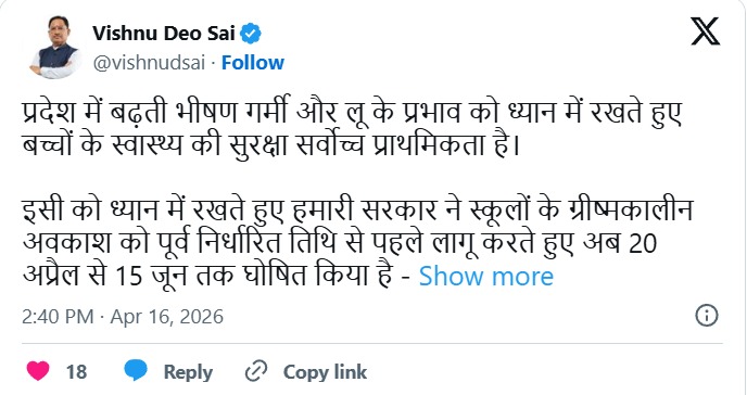 जारी आदेश के अनुसार अब 20 अप्रैल 2026 से 15 जून 2026 तक सभी कक्षाओं का संचालन पूरी तरह बंद रहेगा। यह निर्णय प्रदेश के सभी शासकीय, अनुदान प्राप्त, गैर अनुदान प्राप्त और निजी स्कूलों पर लागू होगा। (छत्तीसगढ़ स्कूल बंद)