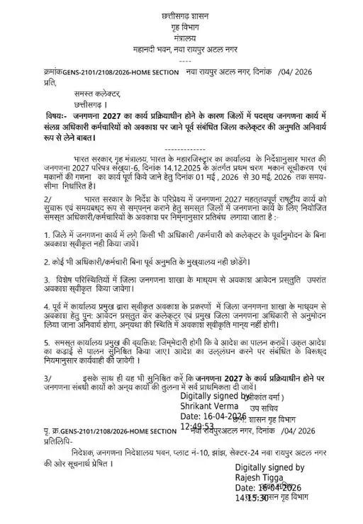 CG Census 2027: छत्तीसगढ़ में जनगणना 2027 की तैयारियों के बीच राज्य सरकार ने सरकारी अधिकारियों और कर्मचारियों की छुट्टियों को लेकर सख्त निर्देश जारी किए हैं। गृह विभाग ने सभी जिलों के कलेक्टरों को आदेश दिया है कि जनगणना कार्य में लगे किसी भी कर्मचारी को बिना अनुमति अवकाश नहीं दिया जाएगा। (छत्तीसगढ़ सरकारी कर्मचारियों की छुट्टी पर रोक)