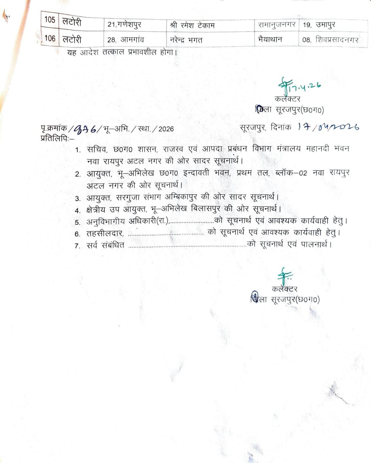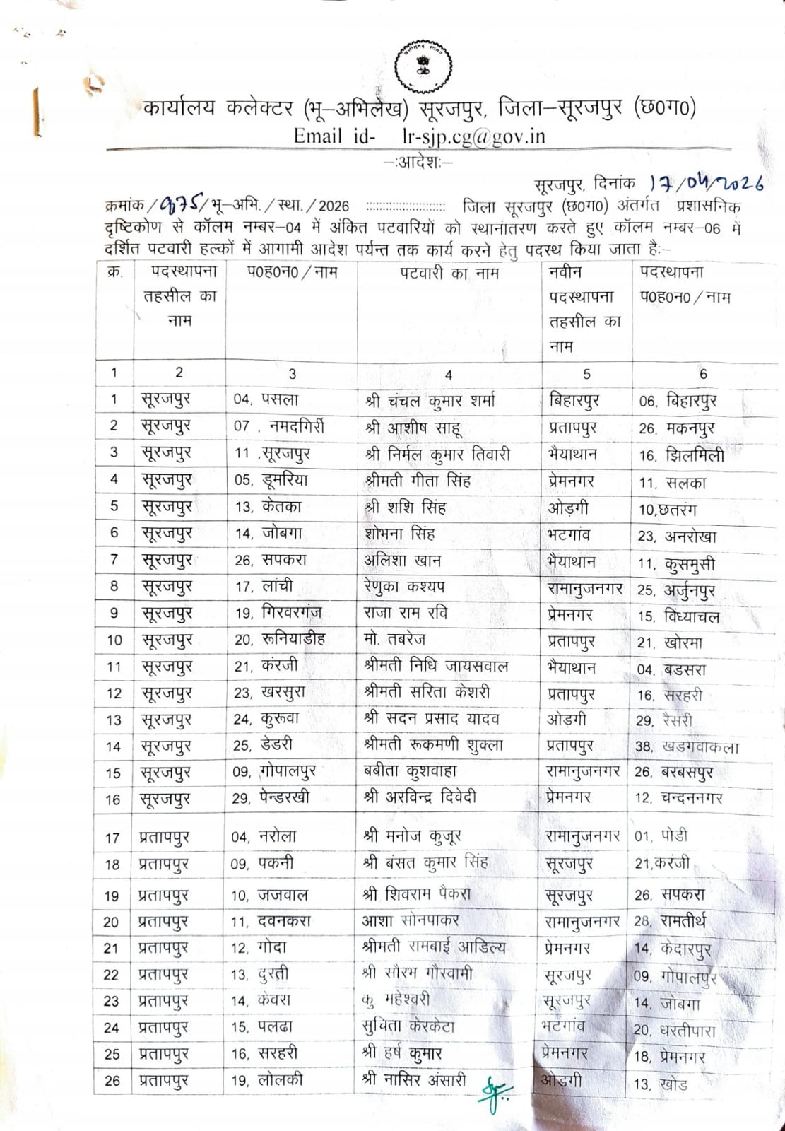 इसी प्रकार बिहारपुर तहसील के भरत पैंकरा को सूरजपुर नमदगिरी, ओडग़ी तहसील के खोड़ से दलसाय को लटोरी के हरिहरपुर, छातरंग के अर्जुन सिंह को सूरजपुर के लांची, भाड़ी के जितेश कुमार दुुबे को रामानुजनगर के मांजा, रैसरी के सुनील कुमार गुप्ता को ओडग़ी के बेदमी तथा दवना के राहुल गुप्ता (RI-Patwari’s transfer) को रामानुजनगर के गोपीपुर में पदस्थ किया गया है।