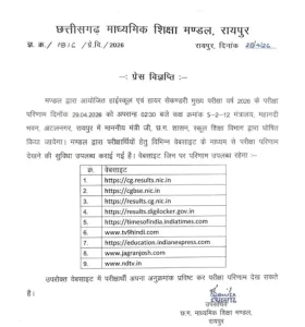 - छत्तीसगढ़ बोर्ड रिजल्ट 2026 डाउनलोड करने के लिए छात्र आधिकारिक वेबसाइट पर जाएं।