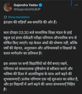 शिक्षा मंत्री गजेंद्र यादव ने सोशल मीडिया एक्स पर के जरिए जानकारी साझा करते हुए कहा कि यह सिर्फ अंकों की घोषणा नहीं, बल्कि विद्यार्थियों की वर्षों की मेहनत, अनुशासन और शिक्षकों व अभिभावकों के मार्गदर्शन का परिणाम है।